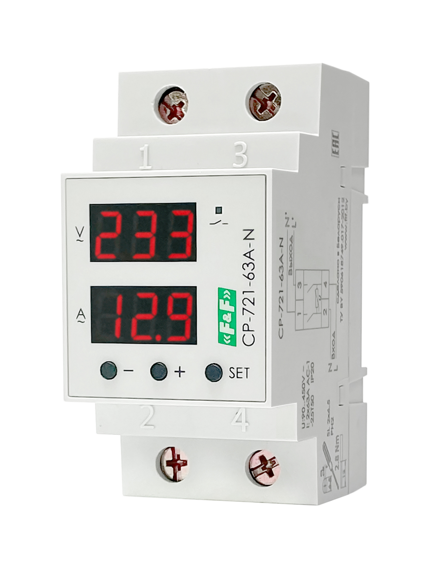 Напряжение питания 90..450 В; Контакт 2NO, 2x63 А; Разрыв фазного и нулевого проводника; 3 варианта настройки реле; Встроенный таймер; Регистрация аварий в памяти; Защита от циклической нестабильности в сети; Регулировка яркости индикатора; Защита от перегрева; Коррекция показаний напряжения и тока.