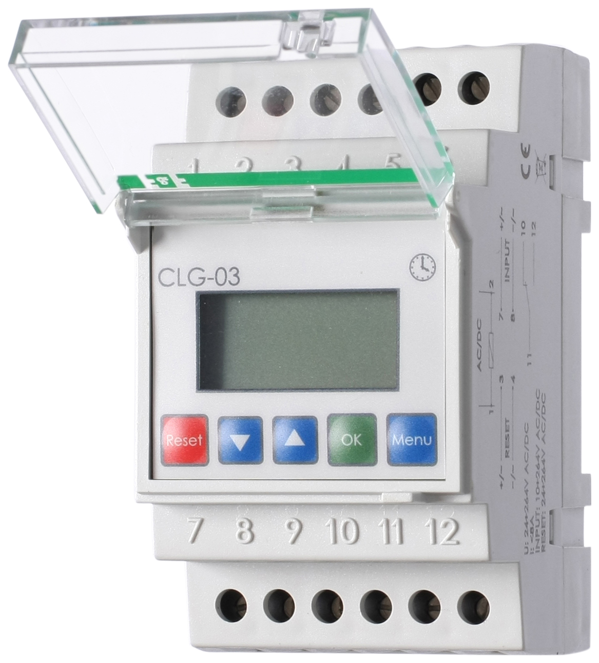 Особенности: вход сброса; управление нагрузкой с помощью выходных реле; сохранение результатов счёта при отключении питания; выбор состояния выходного реле при достижении заданного количества импульсов; программирование счётчика с кнопок на лицевой панели прибора; блокировка доступа в меню программирования с помощью PIN-кода; напряжение питания - 24...264 В AC/DC; напряжение на счетном входе - 24...260 В AC/DC; диапазон счета времени - 1...999 999 ч; максимальный ток нагрузки - 8 А; контакт - 1NO/NC.