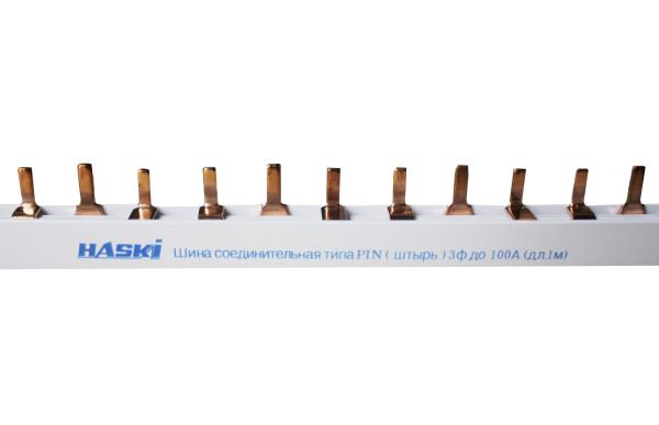 Шины соединительные производятся в двух исполнениях: FORK («вилка») и PIN («штырь») на номинальные токи 63 и 100 А, на одно-, двух-, трех- и четырехфазную нагрузку.